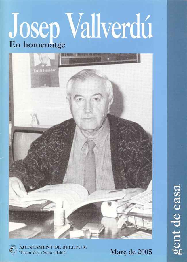 Gent de casa (Ajuntament de Bellpuig, març de 2005) L’Ajuntament de Bellpuig ha decidit retre homenatge a Josep Vallverdú amb un acte públic i l’edició d’un llibret que recull diversos articles sobre la persona i l’obra de Josep Vallverdú. El mateix alcalde de Bellpuig, Josep Pont ha estat l’autor del pròleg d’aquesta publicació (pròleg…
