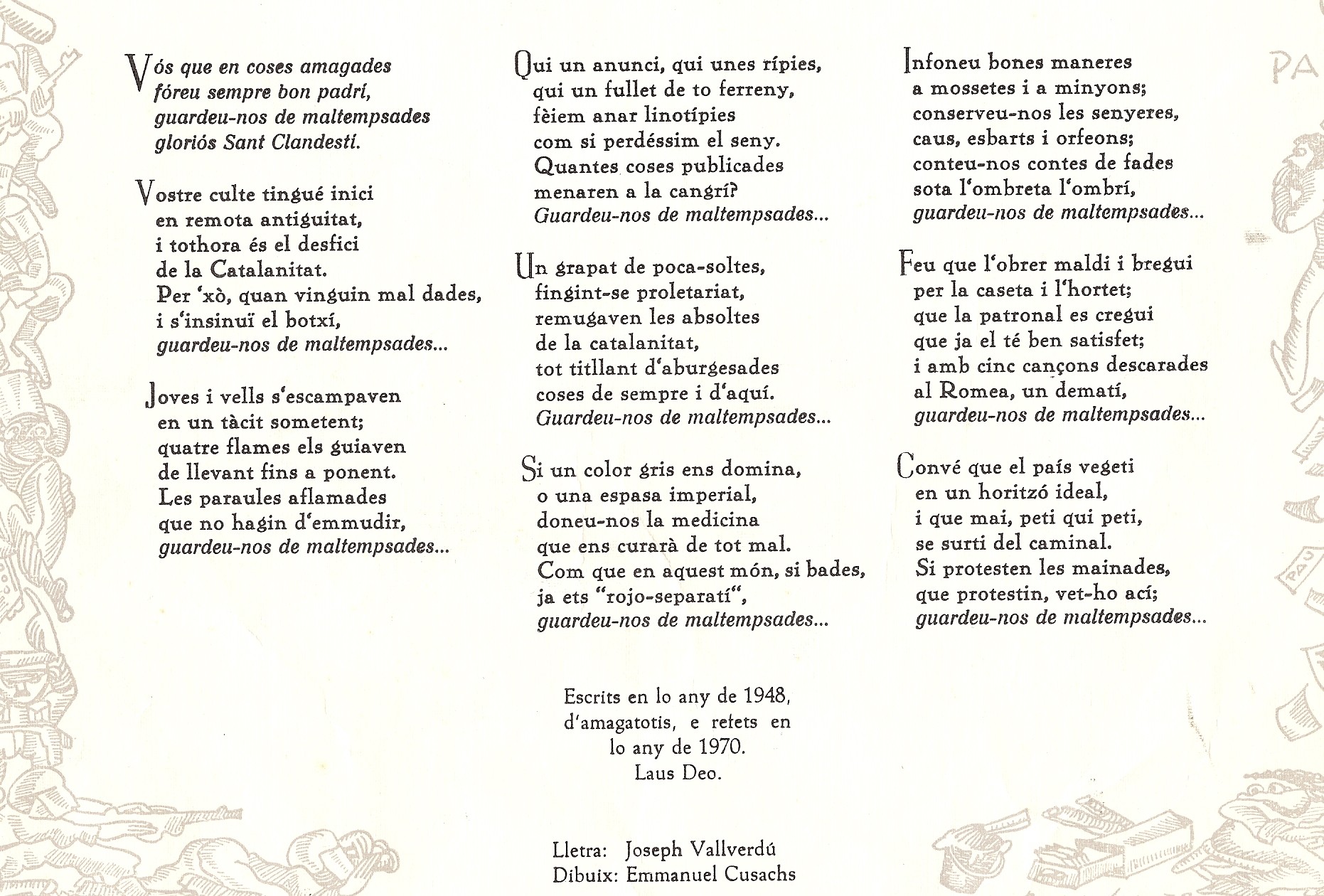 La primera versió dels Goigs data de l’any 1948. La segona, de l’any 1970. Els Goigs porten l’orla corresponent, composta amb figures de conspiradors, policies, àngels, trabucs, multicopistes, porres i garrots, tot dibuixat magistralment i engrescadament per l’escultor Manuel Cusachs, de Mataró, un amic de pedra picada, mai més ben dit.